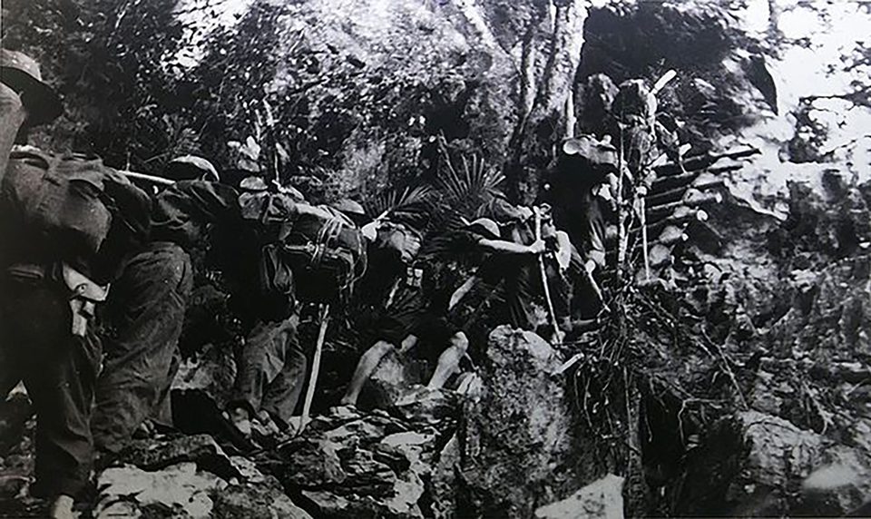 Thời gian đầu, hàng hóa chủ yếu được cõng, gánh để vượt đường Trường Sơn. (Ảnh tư liệu)
