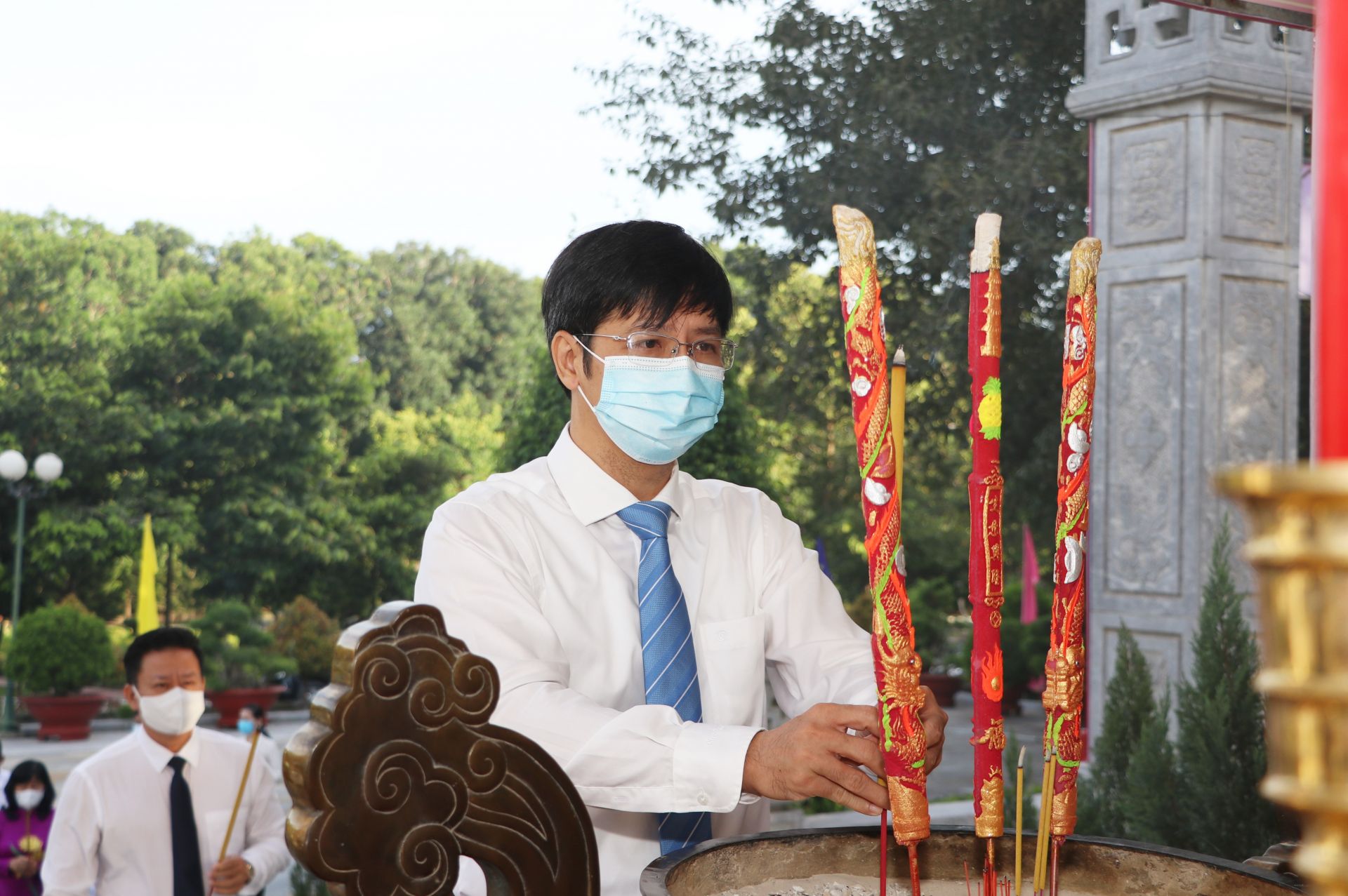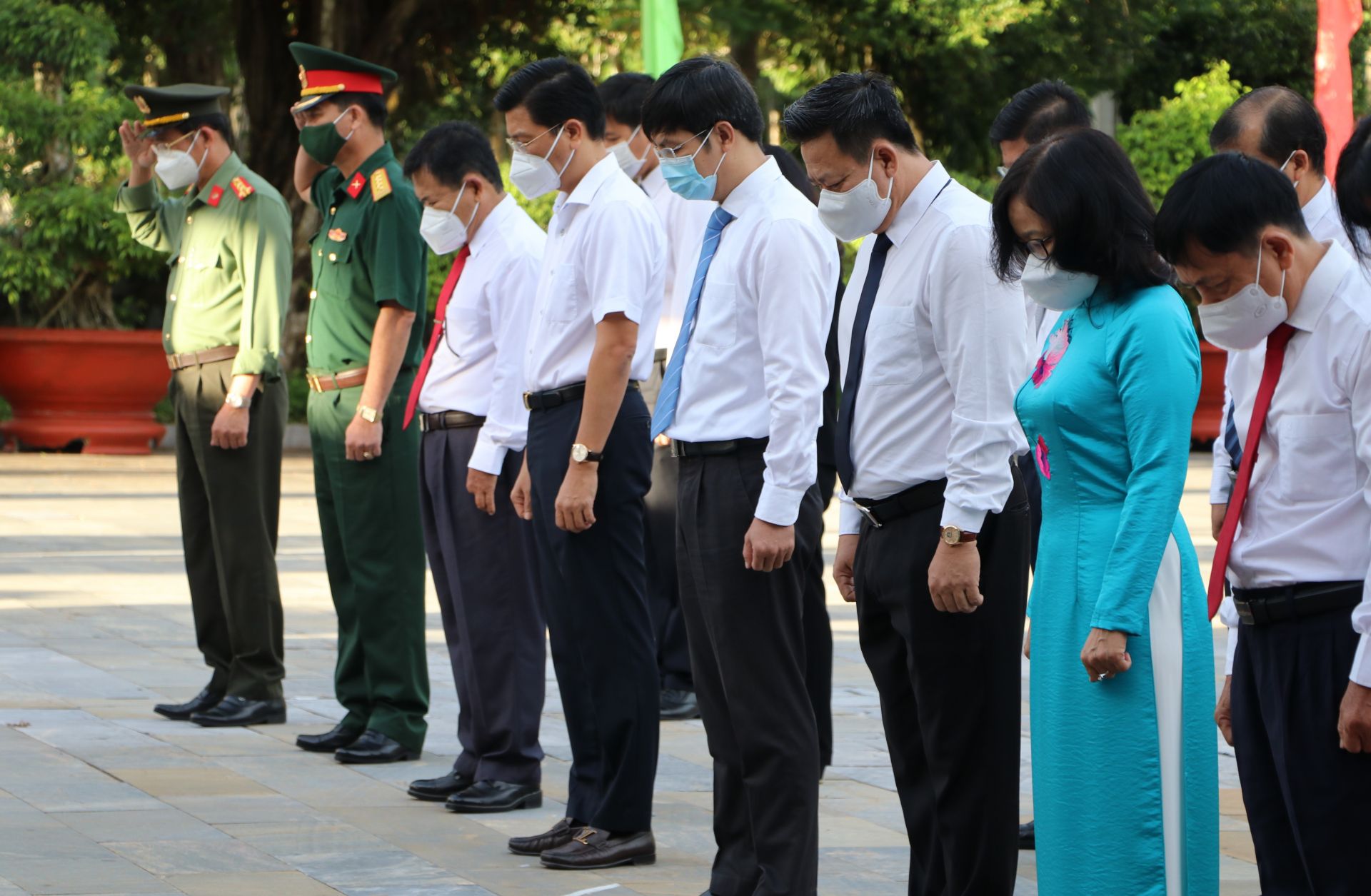 Các đồng chí lãnh đạo thành kính dâng hoa, dâng hương lên Tượng đài liệt sĩ, dành một phút mặc niệm tưởng nhớ đến các anh hùng liệt sĩ và đến thắp hương trên từng phần mộ của các liệt sĩ.