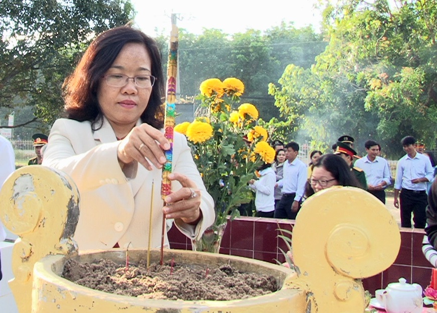 Bà Nguyễn Thị Yến Mai- Bí thư Huyện ủy Châu Thành thắp hương tại Di tích lịch sử - Văn hóa Khu lưu niệm Hoàng Lê Kha. |