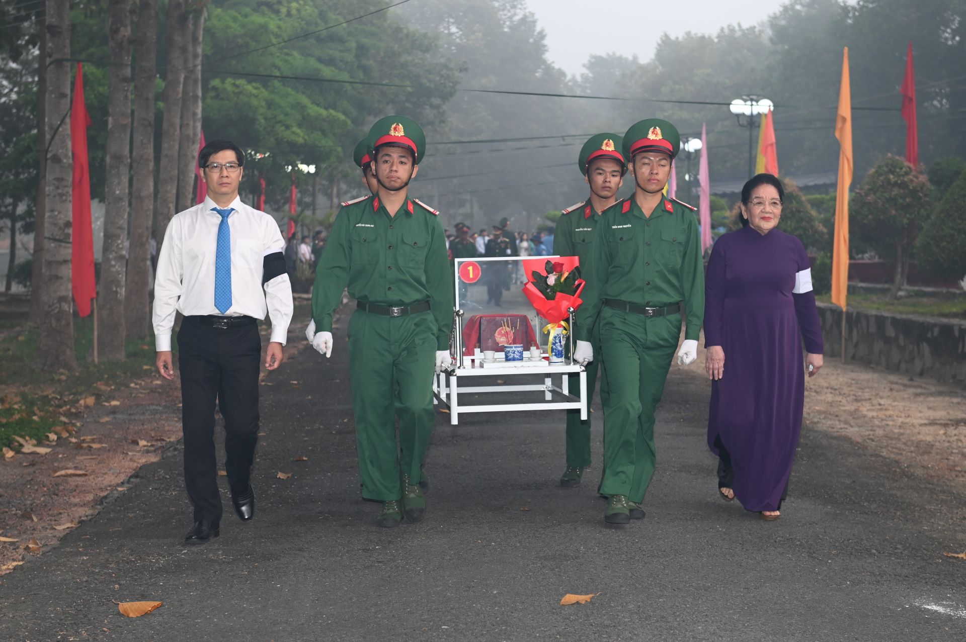 Trước lúc tiễn đưa hài cốt các liệt sĩ đến nơi an nghỉ cuối cùng, lãnh đạo và các đại biểu dành một phút mặc niệm để tưởng nhớ công lao to lớn của các anh hùng liệt sĩ đã anh dũng chiến đấu hy sinh vì độc lập tự do của Tổ quốc và nghĩa vụ quốc tế cao cả.