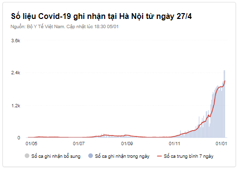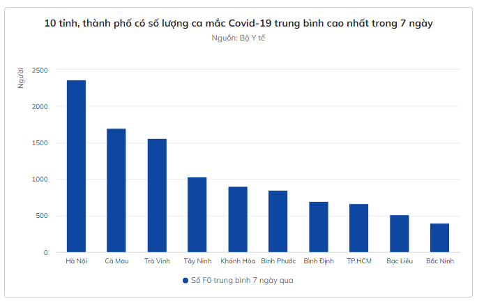 Theo Bộ Y tế, sau 24 giờ, Hà Nội có 2.505 F0 mới, đánh dấu 4 ngày liên tiếp ghi nhận trên 2.000 ca bệnh. Hơn 2 tuần qua, số ca mắc tại thành phố này liên tiếp tăng cao. Trong vòng 7 ngày qua, Hà Nội có trung bình số F0 mới mỗi ngày là 2.363 ca.