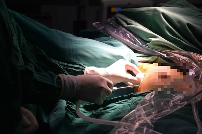 Bác sỹ tiến hành mổ nội soi một lỗ cho bệnh nhân. (Nguồn: Bệnh viện Nội tiết Trung ương)