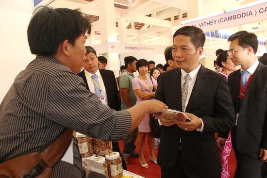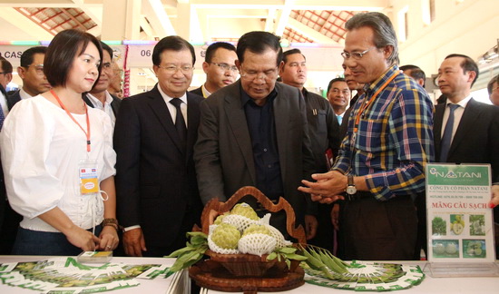 Thủ tướng Campuchia Hun Sen và Phó Thủ tướng Việt Nam Trịnh Đình Dũng tham quan gian hàng của doanh nghiệp Tây Ninh tại Hội chợ thương mại