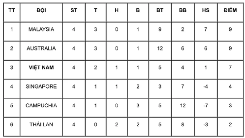 Sau bốn lượt, Malaysia đang đứng đầu bảng với 9 điểm và hiệu số +7. Cùng điểm số, nhưng Australia xếp thứ hai với hiệu số +6. Việt Nam đứng thứ ba với 7 điểm và hiệu số +1. Singapore, Campuchia và Thái Lan đã chắc chắn dừng bước.