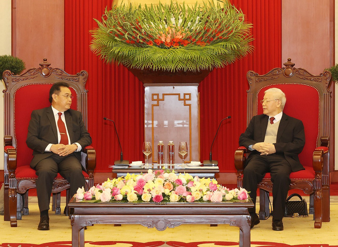 Tổng Bí thư Nguyễn Phú Trọng tiếp Chủ tịch Quốc hội Lào Saysomphone Phomvihane thăm chính thức Việt Nam tại trụ sở Trung ương Đảng sáng 7-12. Ảnh: TTXVN