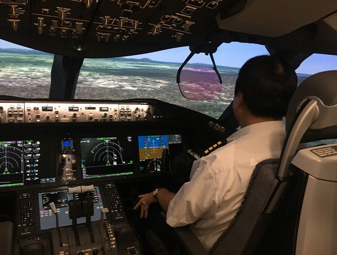 Phi công trong buồng lái mô phỏng dòng Dreamliner 787. Ảnh: Thái Phương