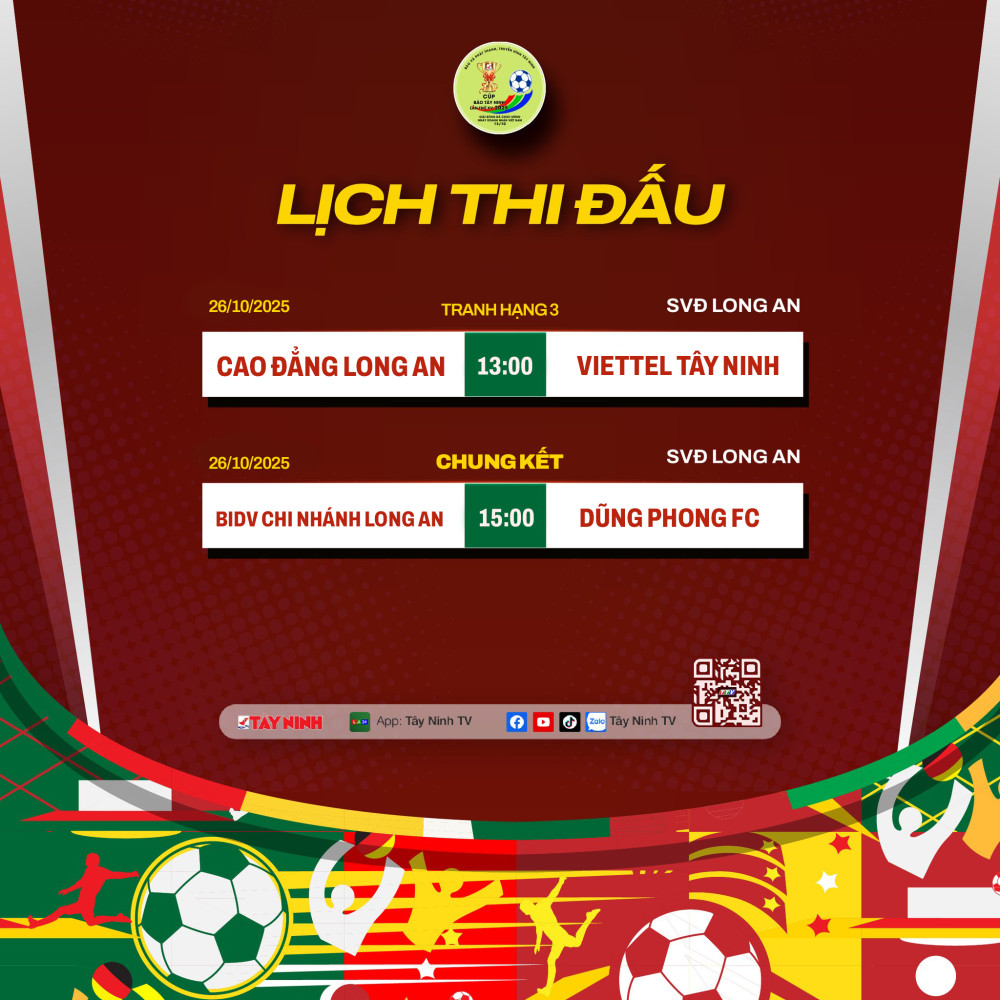 Hai đội bóng – hai hành trình khác nhau nhưng chung một mục tiêu: khép lại giải đấu bằng một chiến thắng danh dự và một trận cầu đẹp mắt. Trận tranh hạng Ba giữa Viettel Tây Ninh và Trường Cao đẳng Long An diễn ra lúc 13 giờ ngày 26/10/ 2025 trên sân vận động Long An, được livestream trực tiếp trên baotayninh.vn, baolongan.vn và các nền tảng Fanpage, YouTube của Báo và phát thanh, truyền hình Tây Ninh.