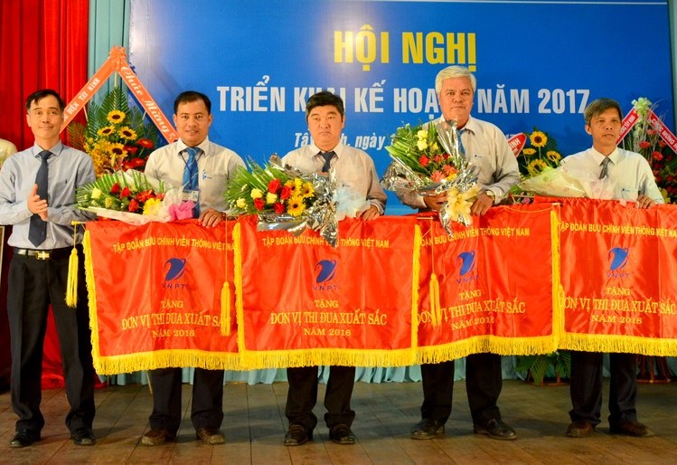 Lãnh đạo tỉnh Tây Ninh và Tập đoàn Bưu chính Viễn thông Việt Nam trao cờ “Đơn vị thi đua xuất sắc” năm 2016 cho VNPT Tây Ninh và Trung tâm Kinh doanh VNPT. |