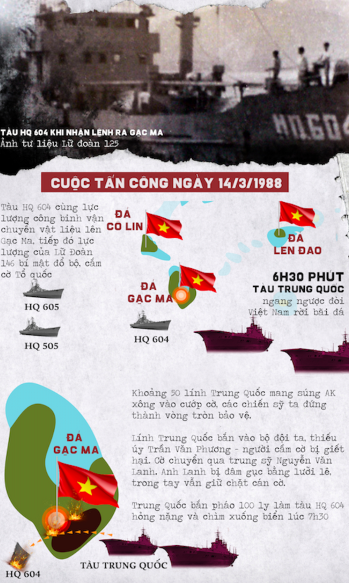 Sau đó, các tàu Trung Quốc bắn chết và trọng thương các chiến sĩ trên đá Gạc Ma. Tàu HQ 604 tìm cách tiếp cận đảo cũng bị tàu Trung Quốc bắn chìm.