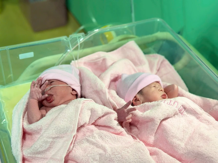 Tiếp theo, vào lúc 0 giờ 1 phút, cặp song sinh là hai bé gái đáng yêu đã cất tiếng khóc chào đời.