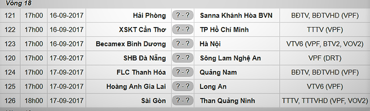 Lịch thi đấu vòng 18 V-League: