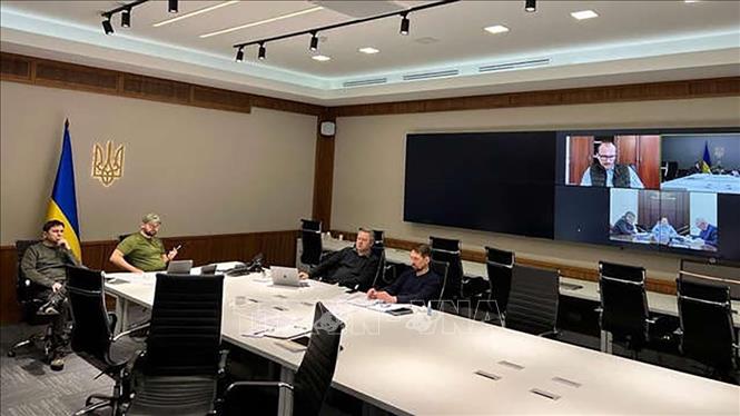 Đàm phán trực tuyến giữa đại diện Nga và Ukraine ngày 15/3/2022. Ảnh: Twitter of Mykhailo Podolyak/TTXVN