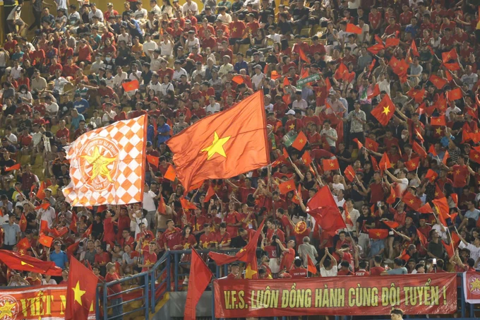 Khán giả cổ vũ cho đội tuyển bóng đá Việt Nam trong trận đấu với tuyển Lào tại sân Gò Đậu (Bình Dương), tối 25-3. Ảnh: DŨNG PHƯƠNG