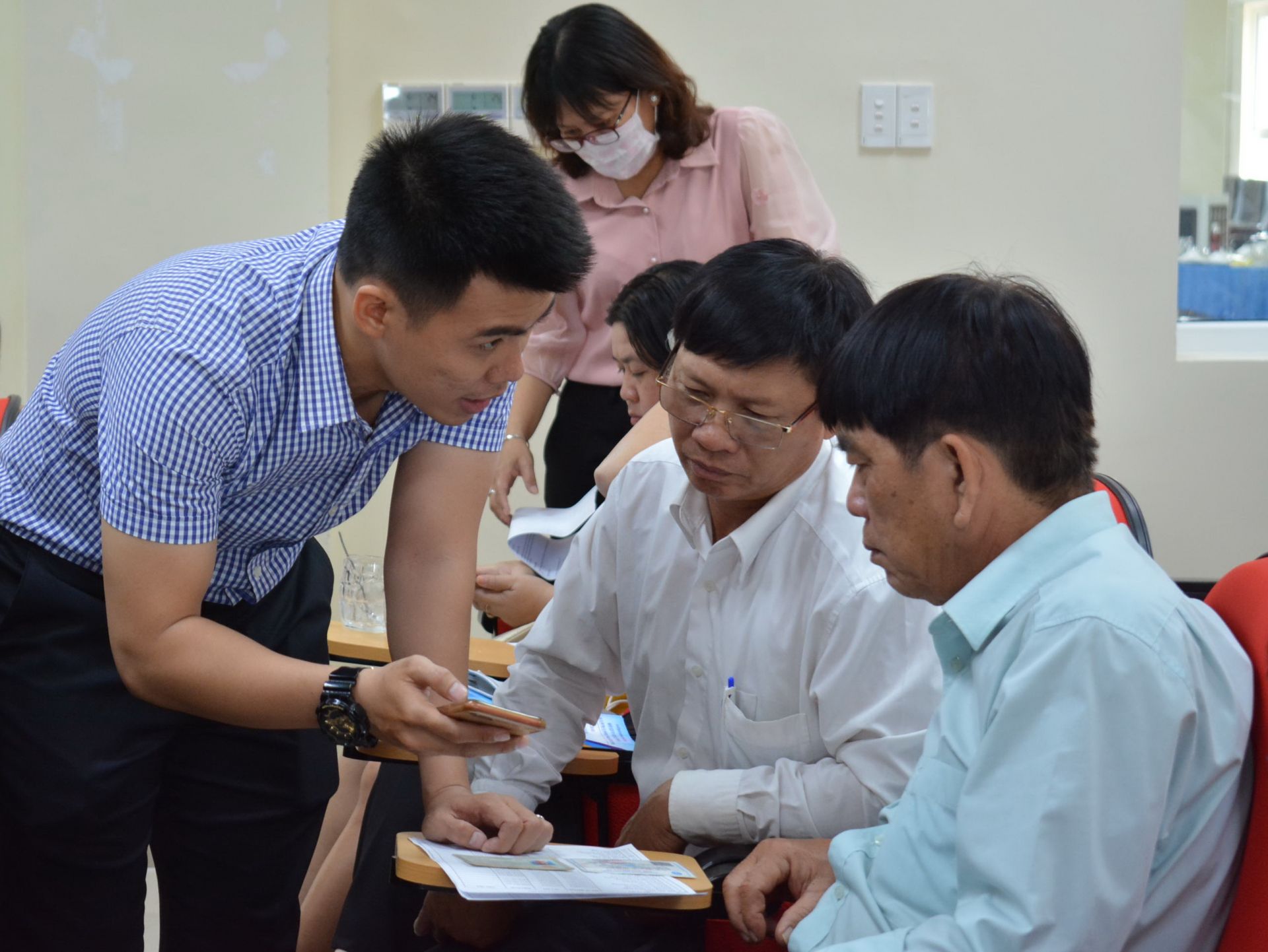 Nhân viên BHXH hướng dẫn các đại biểu cài đặt VssID tại BHXH Tây Ninh.