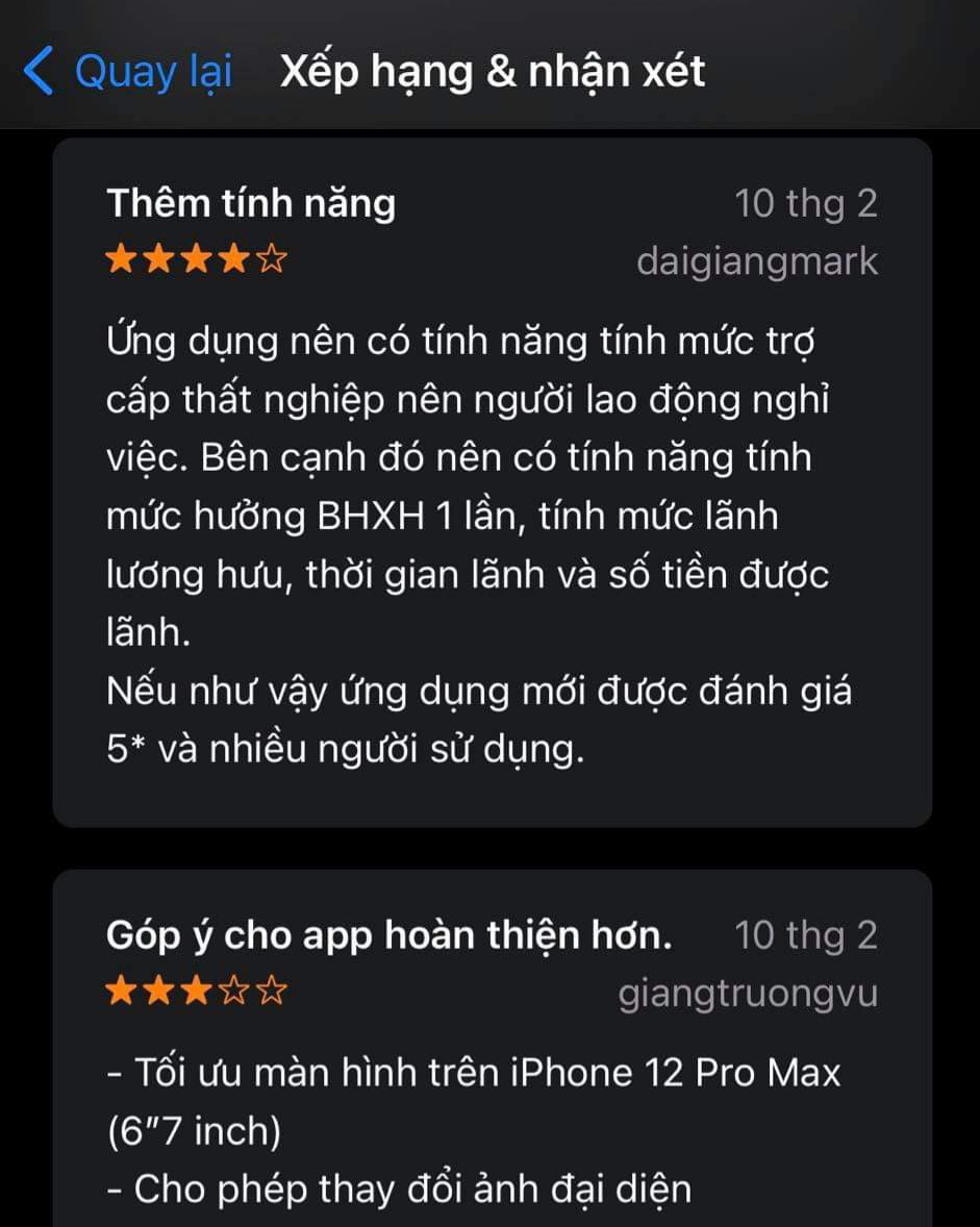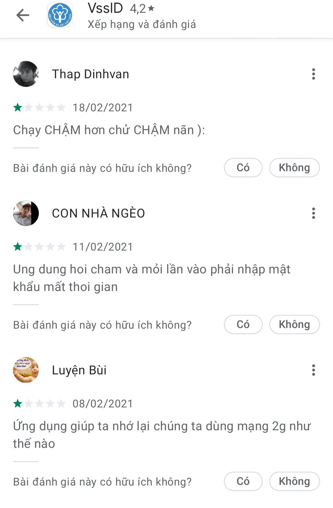 “Quá mất thời gian, tiện đâu không thấy mà đã phải mất một buổi đi in tờ khai và nộp cho cơ quan BHXH”- tài khoản Phạm Hà nhận xét vào ngày 20.1.2021. “Ðăng ký phiền phức, app thì chậm dù xài mạng tốc độ cao”- tài khoản Vy Ưng nhận xét vào ngày 21.1.2021.