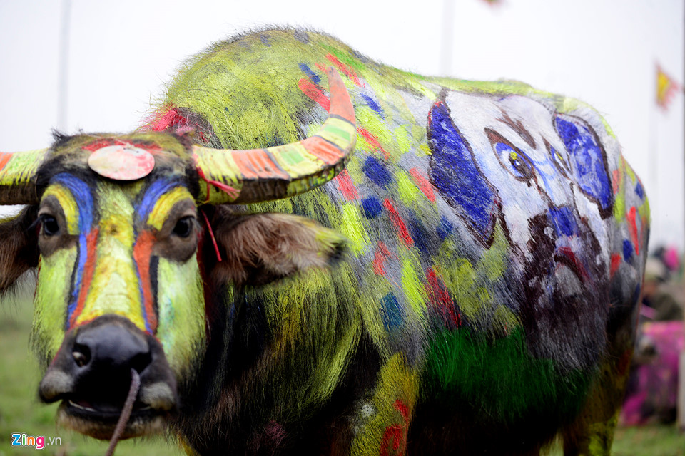 Những con trâu màu sắc sặc sỡ được trang trí bắt mắt, thậm chí vẽ hình ảnh chú chó, linh vật của của năm 2018.
