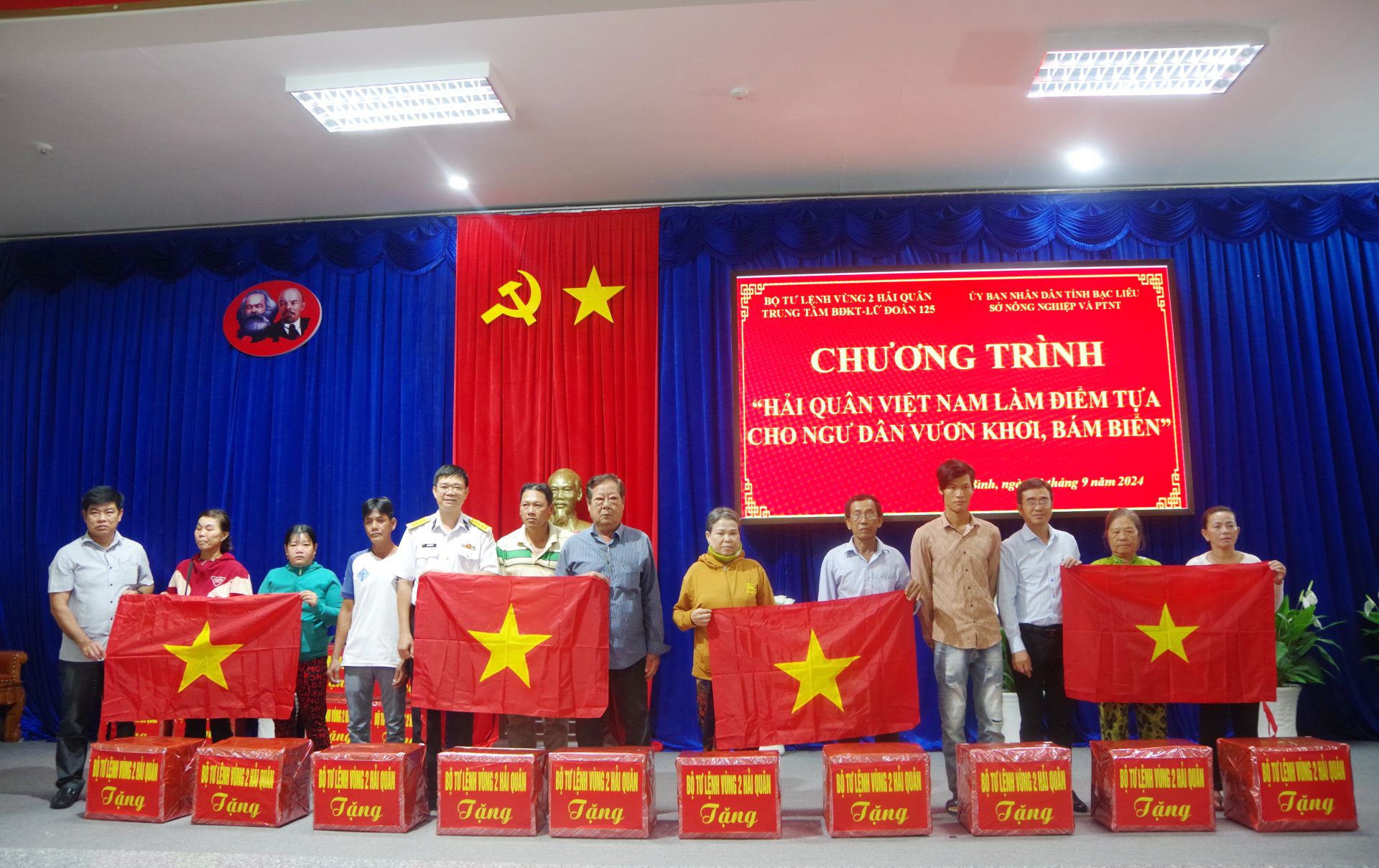 Trong 2 ngày 20-21.9, tại tỉnh Bạc Liêu, Trung tâm Bảo đảm kỹ thuật (BĐKT) và Lữ đoàn 125 Vùng 2 Hải quân phối hợp với Ban Tuyên giáo Tỉnh uỷ, Sở Nông nghiệp và Phát triển nông thôn tỉnh Bạc Liêu tổ chức tuyên truyền biển, đảo, tuyên truyền thu hút nguồn nhân lực và thực hiện chương trình “Hải quân Việt Nam làm điểm tựa cho ngư dân vươn khơi bám biển”.