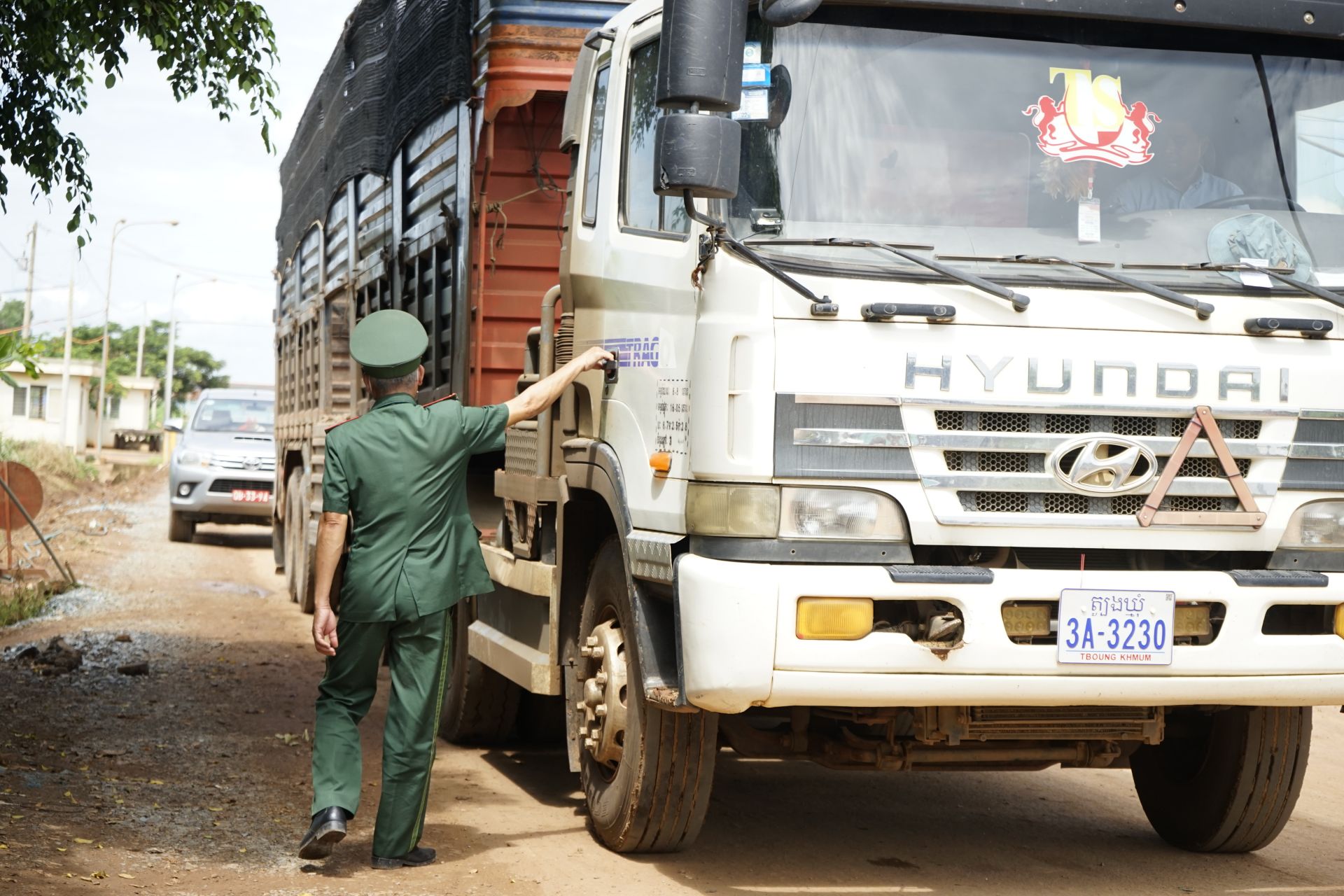 Cán bộ Đồn Biên phòng Cửa khẩu Chàng Riệc kiểm tra phương tiện ô tô tải qua cửa khẩu Chàng Riệc.