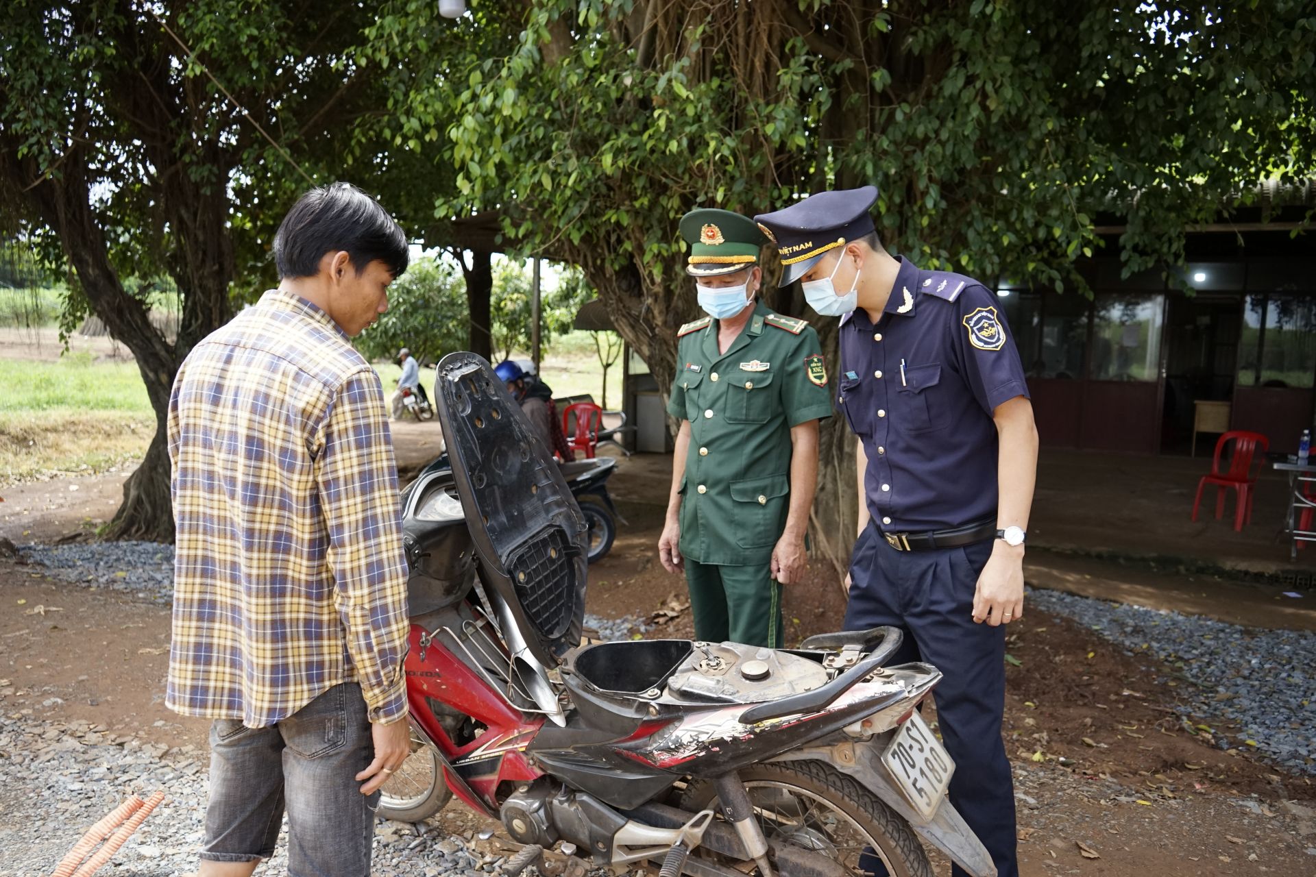 Lực lượng chức năng kiểm tra phương tiện xe mô tô qua cửa khẩu Chàng Riệc.