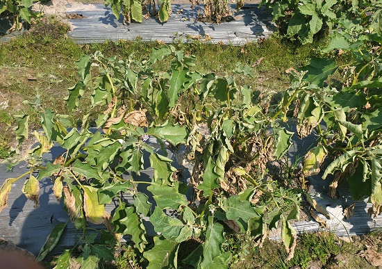 Theo ông Phương, vườn cà của ông đã thu hoạch được 4 đợt, thế nhưng khoảng nửa tháng trở lại đây vườn cà liên tục héo lá rồi chết, hiện gần 50% vườn bị chết dù ông tưới nước và bón phân đầy đủ.