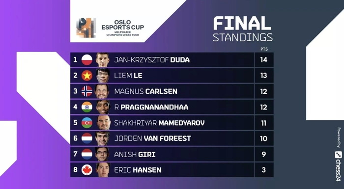 Ngày thi đấu cuối cùng Giải cờ vua trực tuyến Oslo Esports Cup 2022 đã diễn ra theo kịch bản khó tin. Vua cờ Carlsen và thần đồng Ấn Độ Rameshbabu Praggnanandhaa bất ngờ cùng thất bại 0,5-2,5 trước Shakhriyar Mamedyarov và Anish Giri. Cơ hội đăng quang được trao cho Jan-Krzysztof Duda và Quang Liêm. Tuy nhiên, nhà đương kim vô địch World Cup Jan-Krzysztof Duda đã tận dụng cơ hội tốt hơn kỳ thủ số 1 Việt Nam để giành ngôi vô địch, khi anh thắng 2,5-0,5 trước Eric Hansen mà không cần đến tie-break như Quang Liêm.