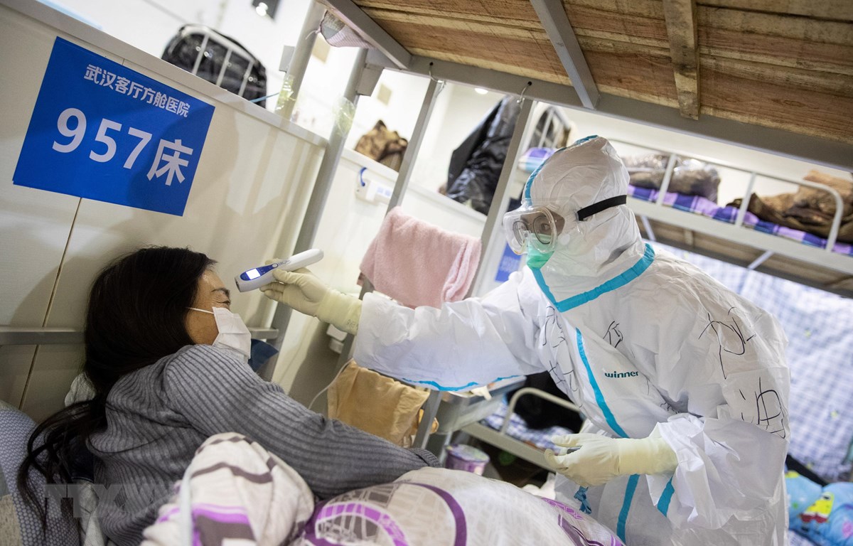 Nhân viên y tế kiểm tra thân nhiệt một bệnh nhân nghi nhiễm COVID-19. (Ảnh: AFP/TTXVN)