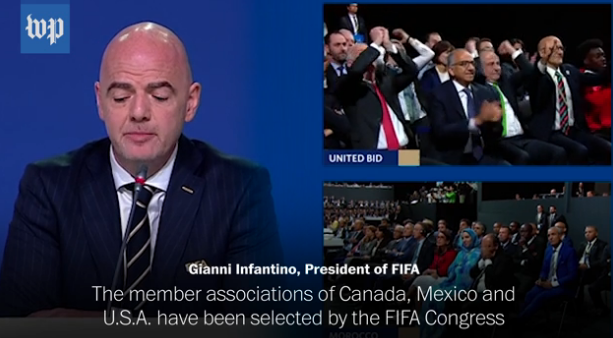 Chủ tịch FIFA Gianni Infantino trao chứng nhận quyền đăng cai World Cup 2026 cho Chủ tịch Liên đoàn Bóng đá Canada-Mexico-Mỹ. Nguồn: The Washington Post.