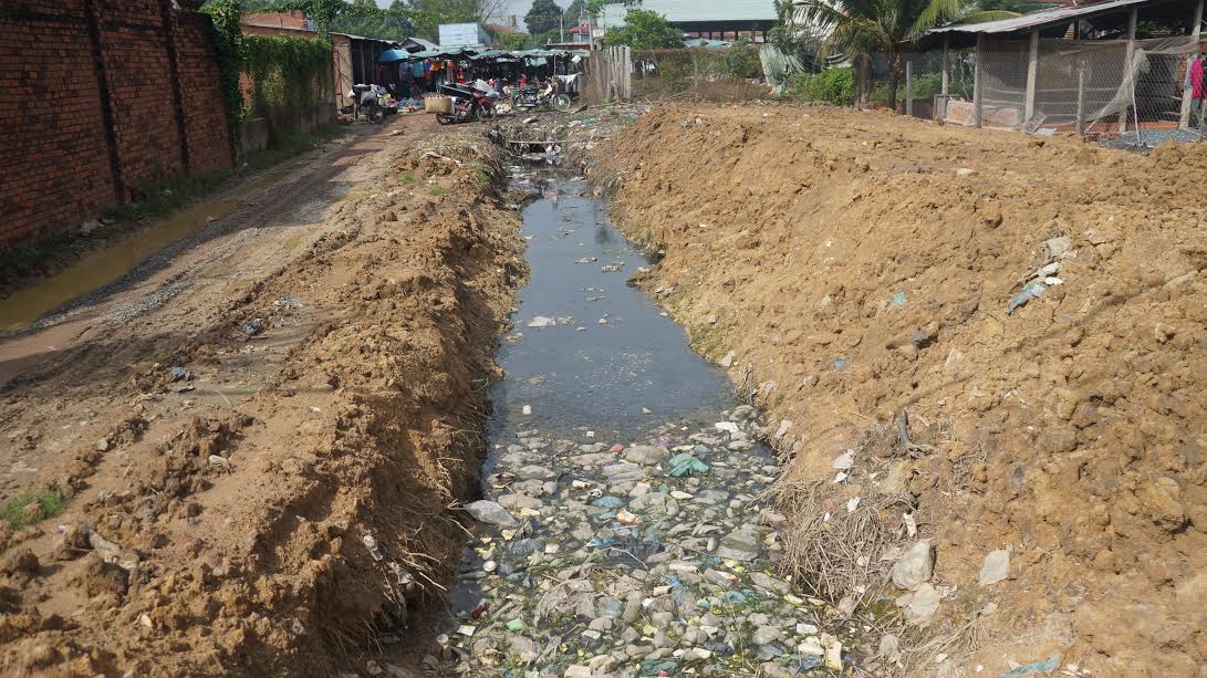 Mương thoát nước ở chợ Bình Thạnh biến thành bãi chứa rác thải, gây ô nhiễm môi trường nghiêm trọng. |