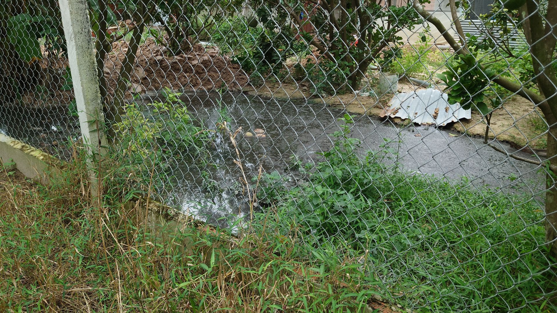 Quan sát thực tế trưa 11.9.2023, ghi nhận phản ánh của ông T là có cơ sở. Khu vực phía sau chuồng heo đến phần đất của ông T khoảng 10 mét có một mương nhỏ, dẫn nước thải và phân heo ra đến khu vực hàng rào, đọng thành vũng lớn bốc mùi hôi thối khá nồng nặc và thấm dưới chân hàng rào tràn vào vườn bưởi giáp ranh.
