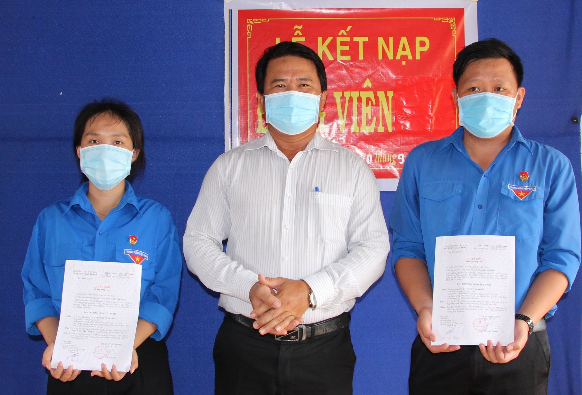 Ngày 10.9, Chi bộ ấp Cầy Xiêng, xã Đồng Khởi (huyện Châu Thành) tổ chức lễ kết nạp Đảng cho 2 đoàn viên ưu tú Nguyễn Minh Dĩ (Bí thư Chi đoàn ấp) và Nguyễn Thị Thu Giang (Phó Bí thư Chi đoàn ấp). Đây là 2 cán bộ Đoàn tiêu biểu, có nhiều đóng góp trong công tác phòng, chống dịch ở địa phương thời gian qua.