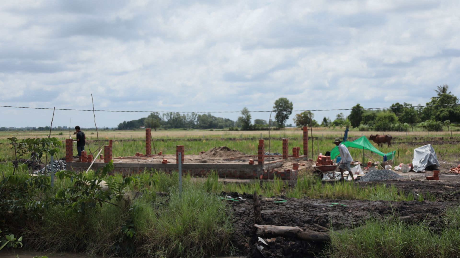Hiện tại, khu đất đã được bà H móc mương bề rộng khoảng 3 mét xung quanh, bên ngoài có đắp bờ bao cao hơn mặt ruộng khoảng 1 mét. Trên bờ, bà trồng một hàng trụ bằng sắt cao khoảng 1,5 mét bên trong có khoảng bốn người đang xây dựng nền nhà bằng gạch rất kiên cố.