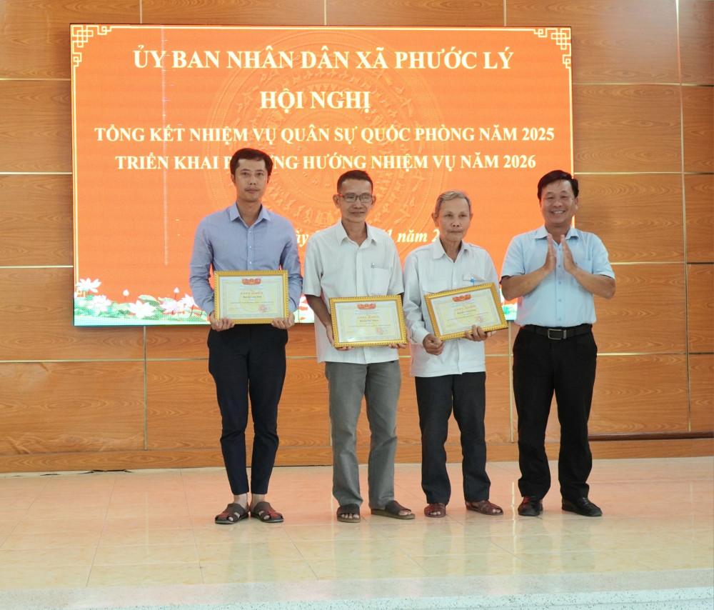 Dịp này, UBND xã Phước Lý tặng giấy khen cho 3 tập thể và 6 cá nhân có thành tích tốt trong thực hiện nhiệm vụ quân sự, quốc phòng năm 2025./.