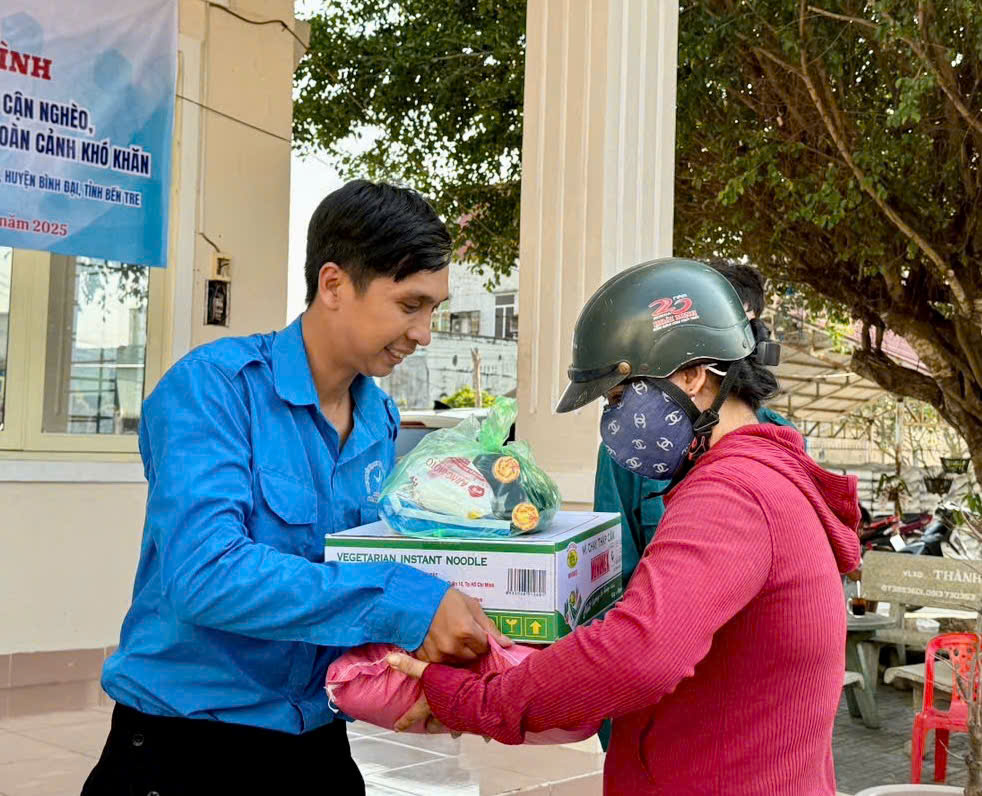 Mỗi phần quà gồm các nhu yếu phẩm như: gạo, đường, bột ngọt, nước tương, mì gói... với tổng trị giá 36 triệu đồng, do 2 đơn vị vận động từ cơ sở Thu Ngân, kinh doanh thuỷ hải sản tại huyện Bình Đại, tỉnh Bến Tre hỗ trợ.