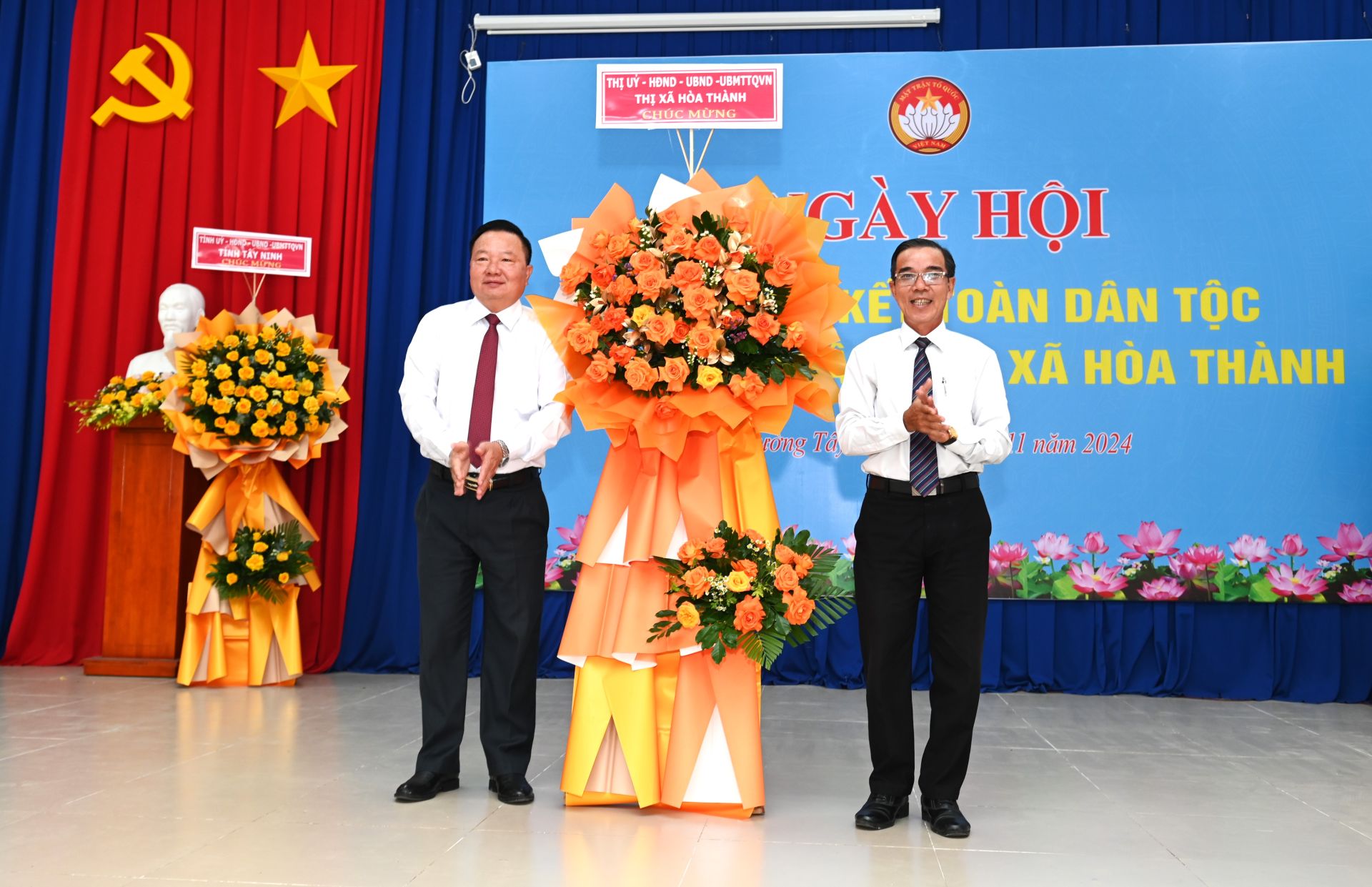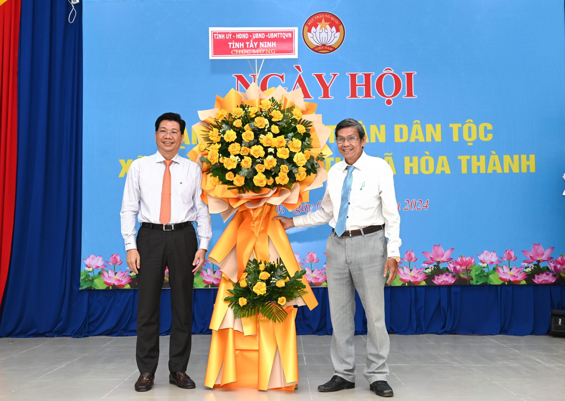 Ông Trần Văn Khải- Bí thư Thị uỷ Hoà Thành tặng lẵng hoa chúc mừng Ngày hội.