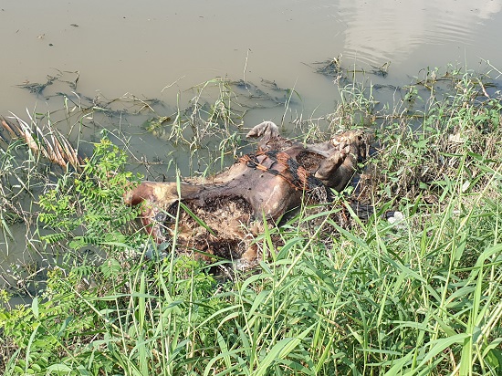 Xác heo chết vứt dưới kênh đang thối rửa.