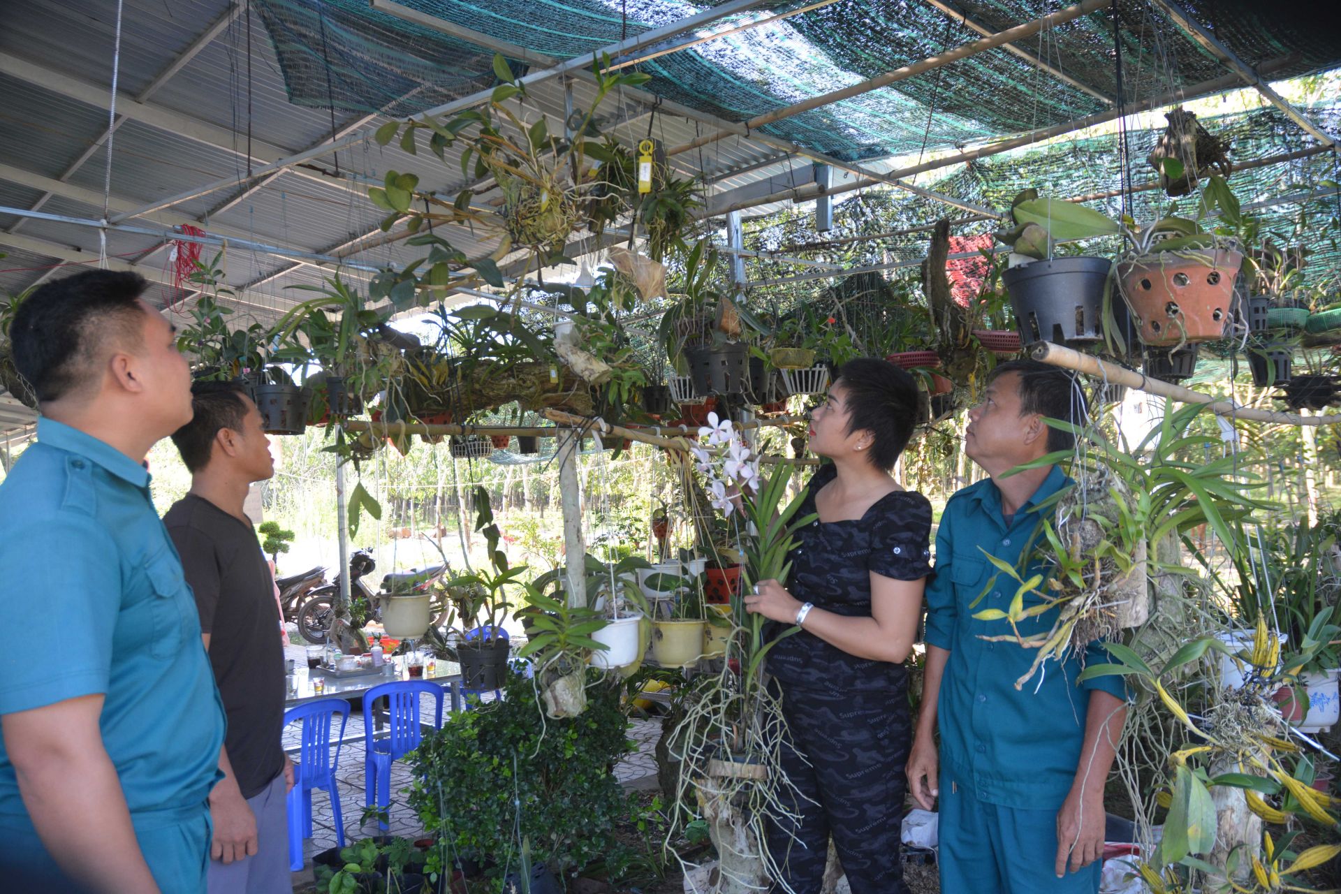 Vợ chồng anh Trương Văn Chình chăm sóc vườn lan của gia đình.