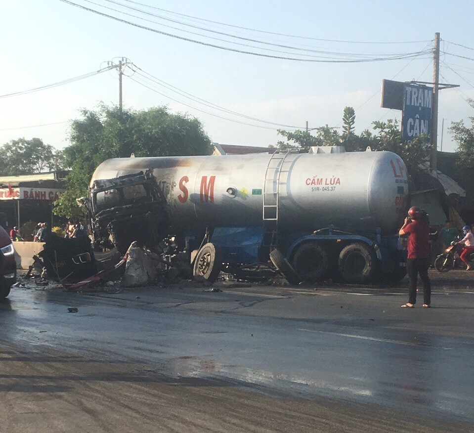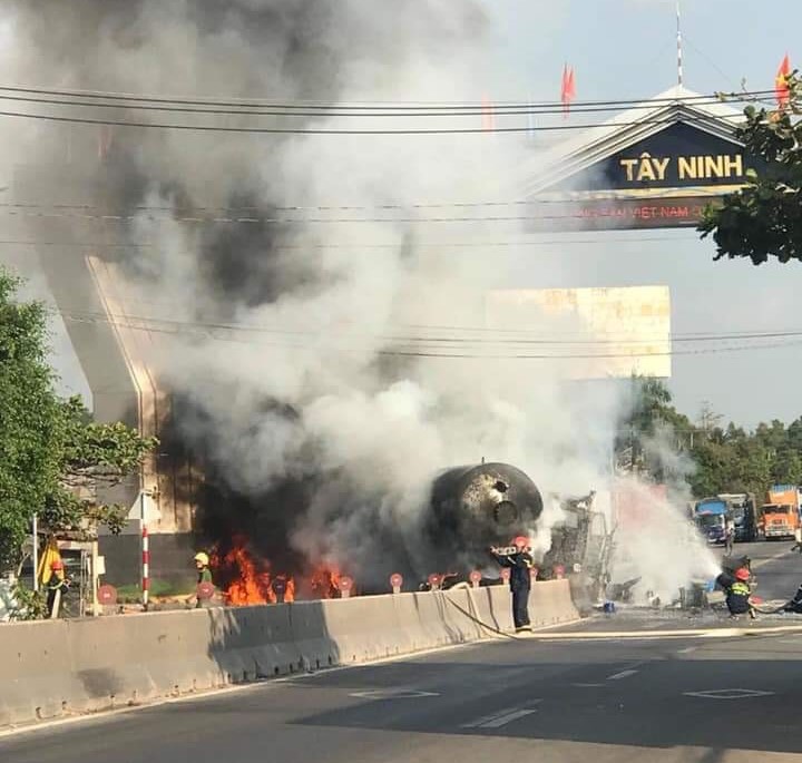Khoảng 16 giờ ngày 15.2, tại cổng chào Tây Ninh (ấp Suối Sâu, xã An Tịnh, huyện Trảng Bàng), người đi đường hoảng hốt khi chứng kiến chiếc xe bồn chở gas loại đầu kéo bốc cháy sau cú va chạm vào dãy phân cách trên Quốc lộ 22.