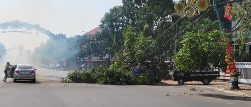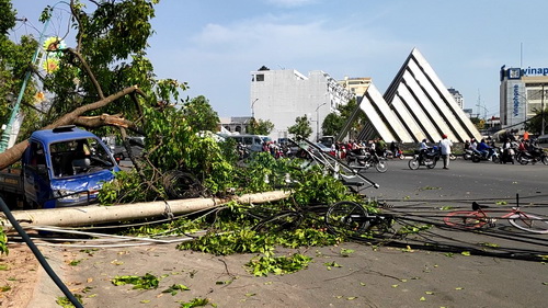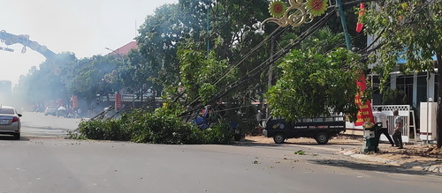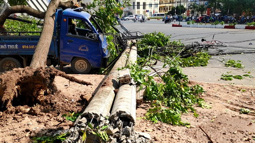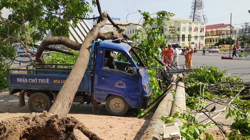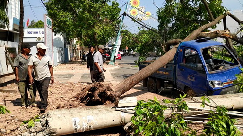Tại hiện trường, một xe chở hàng có biển số 70TĐ-003.53 bị hư hỏng phần đầu xe do cây xanh đè trúng; 2 chiếc xe đạp, cùng hệ thống điện, cáp quang hư hỏng nặng.