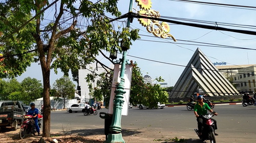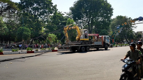 Khoảng 10 giờ ngày 30.1, tại khu vực gần vòng xoay Bưu điện Tây Ninh, một xe cẩu biển số 70C-079.04 chở theo xe múc đất chạy trên đường 30.4 đã máng vào hệ thống dây viễn thông bắc ngang qua đường, làm 2 trụ điện gãy ngang, kéo theo gốc cây xanh và trụ đèn chiếu sáng trước cổng Toà soạn Báo Tây Ninh bị bật ngã.