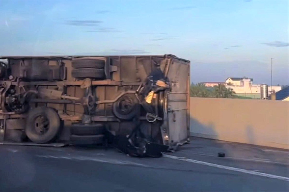 Vụ tai nạn trên cao tốc TP.HCM - Trung Lương khiến xe tải bị lật ngang đường, xe cứu thương biến dạng, tài xế bị thương kẹt trong cabin.