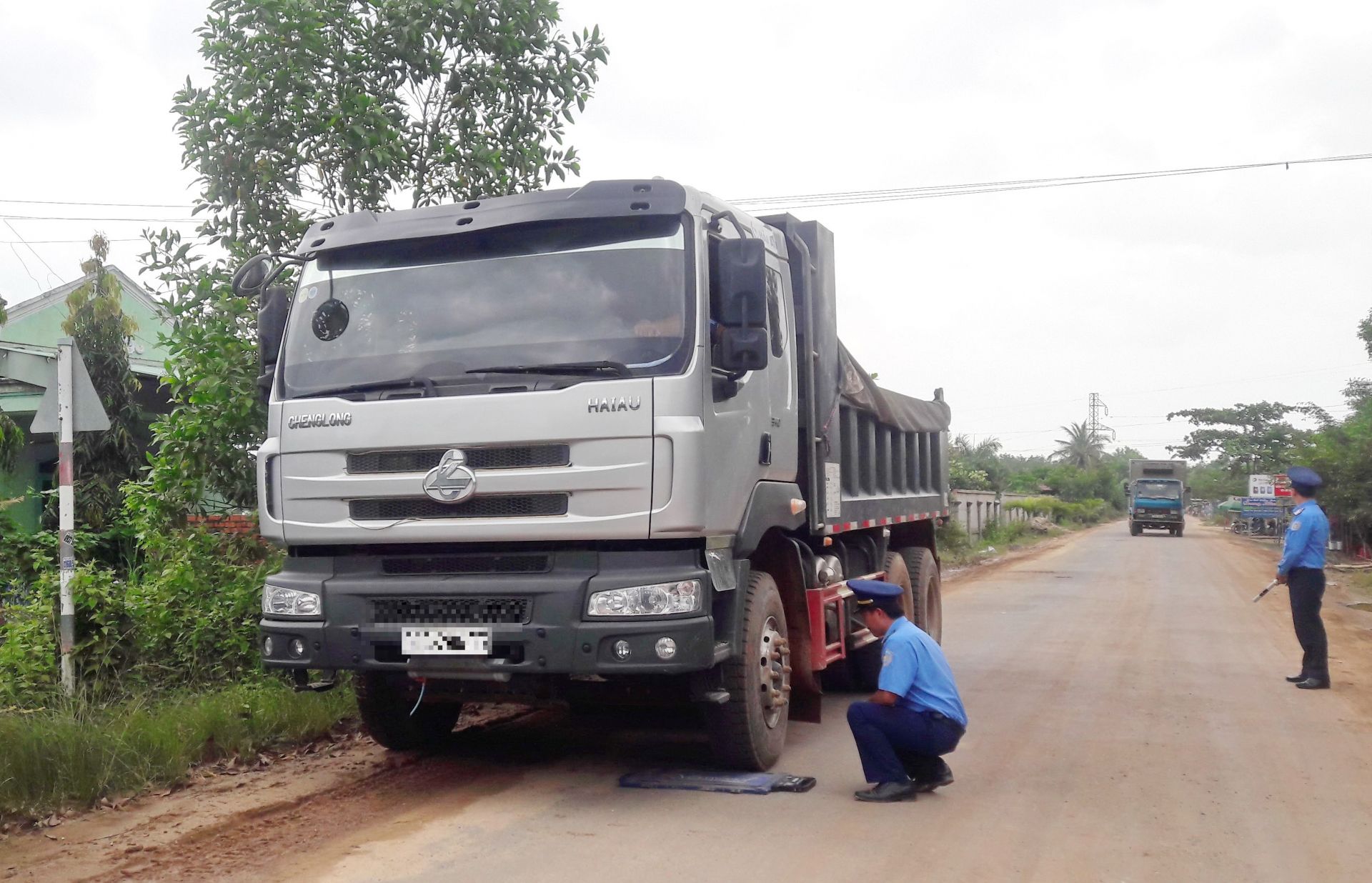 Lực lượng thanh tra giao thông kiểm tra tải trọng xe.