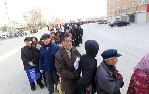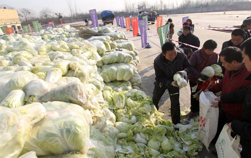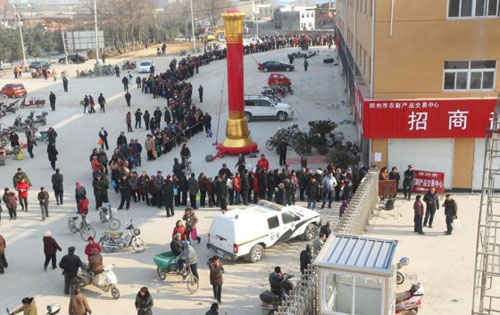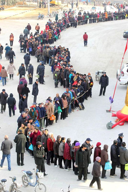 Ngày 15.12, một trung tâm kinh doanh nông sản ở thành phố Trịnh Châu đã tặng 150 tấn củ cải và cải bắp miễn phí cho người dân địa phương. Khi nghe tin, gần 30.000 người dân đã đổ xô đến trung tâm buôn bán để nhận rau miễn phí. Đến 10h sáng cùng ngày, đám đông rồng rắn xếp thành một hàng dài khoảng 1km.