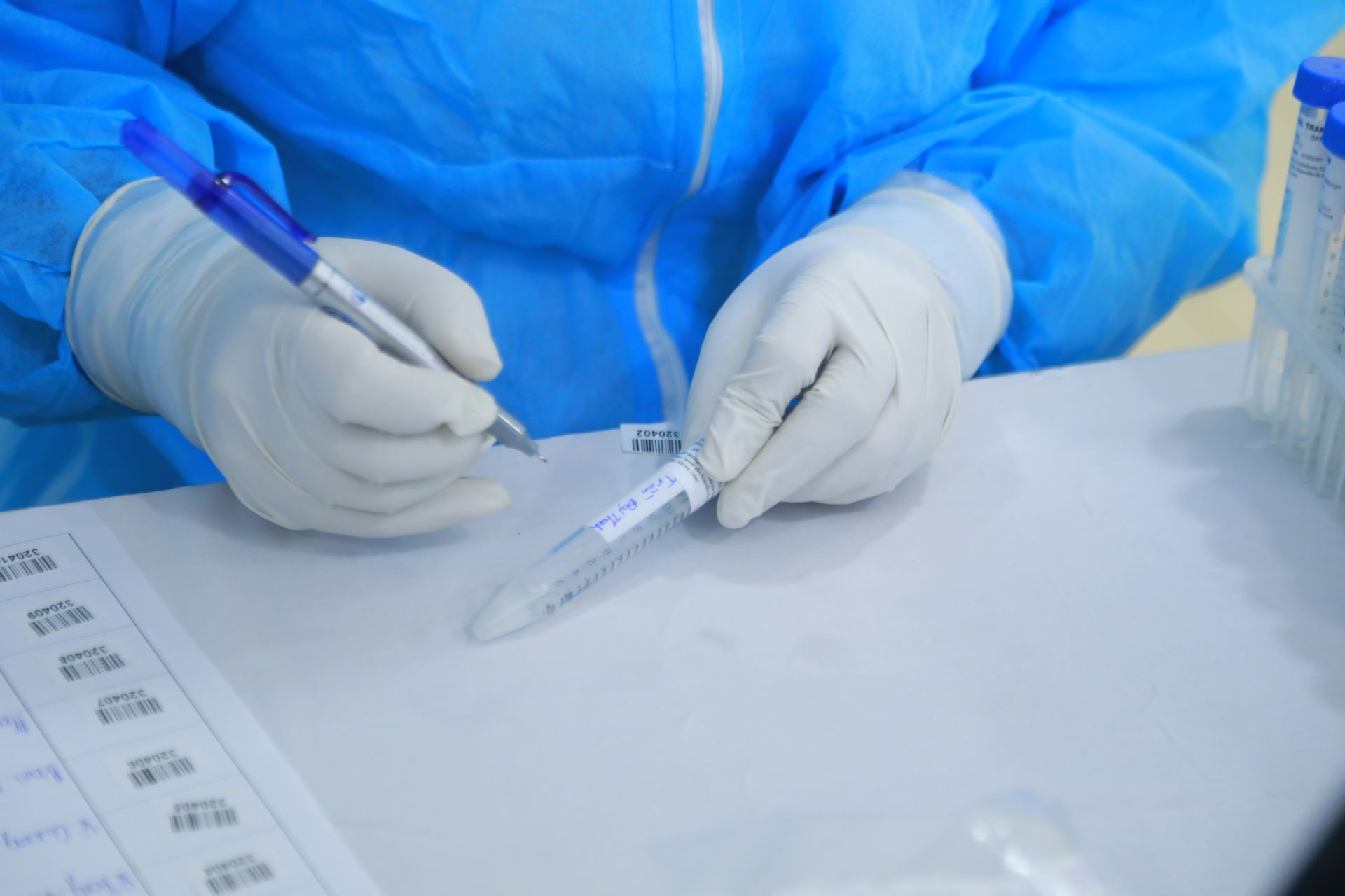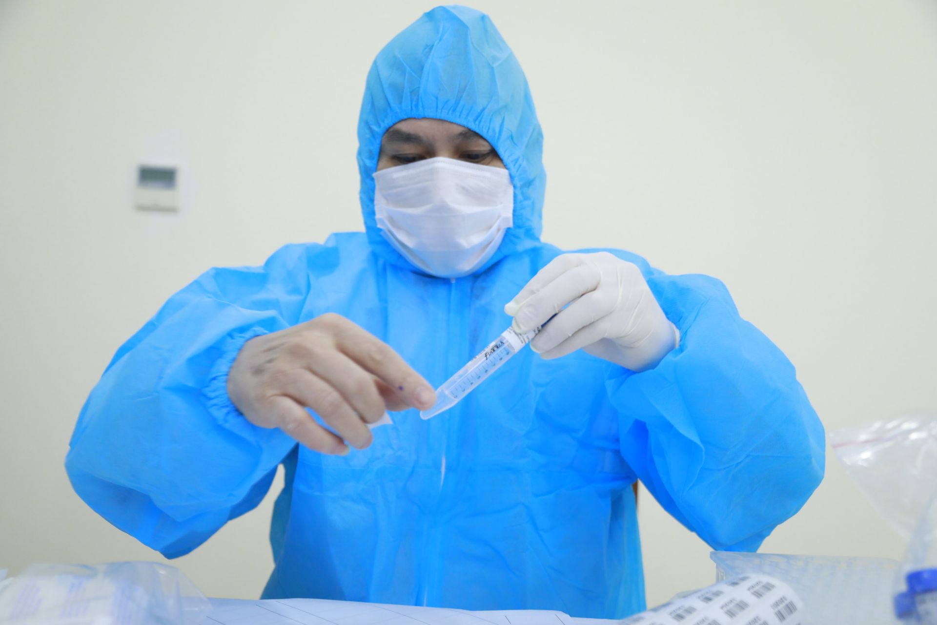 Nhân viên y tế ghi tên, tuổi, địa chỉ của người được xét nghiệm lên ống đựng mẫu dịch.