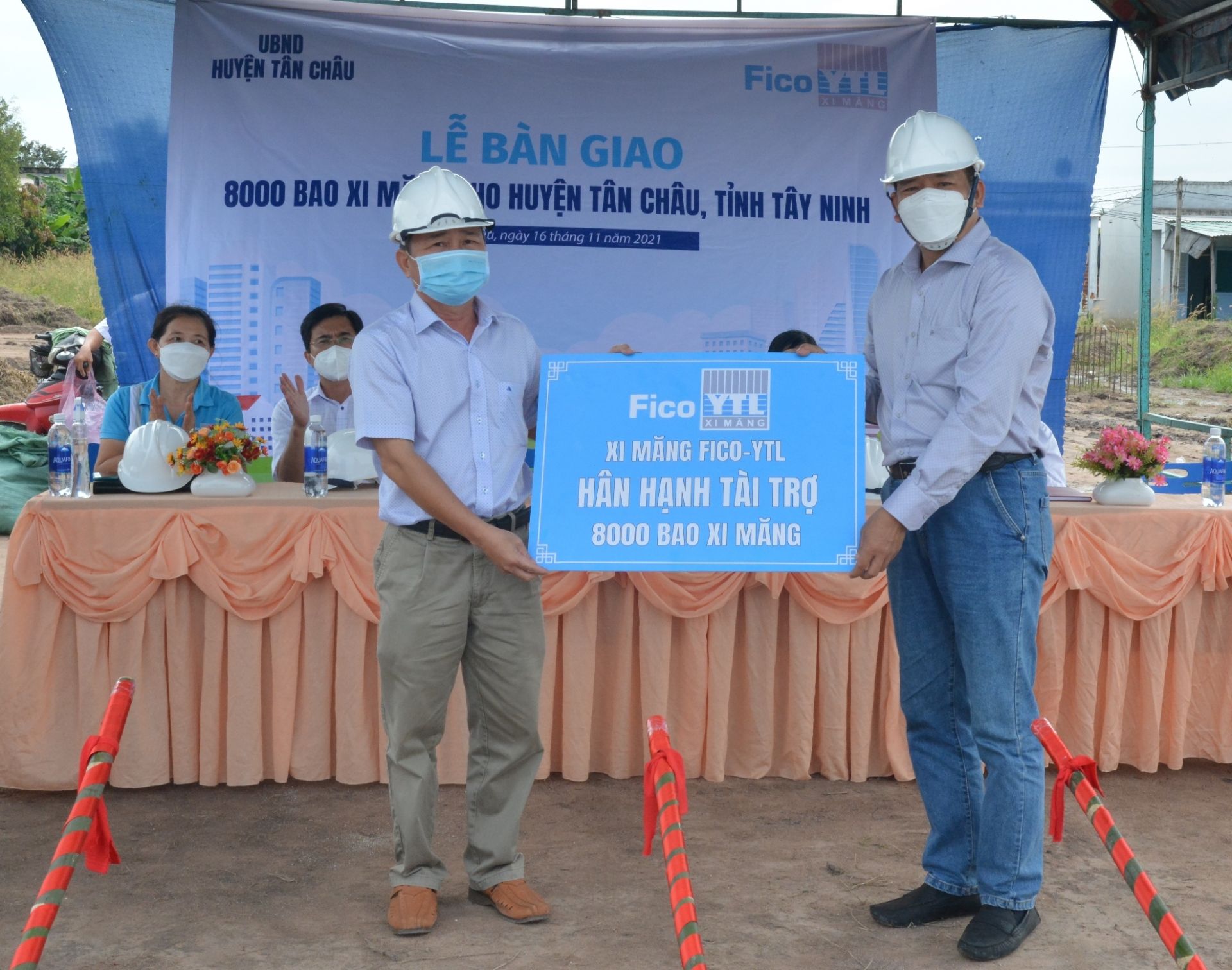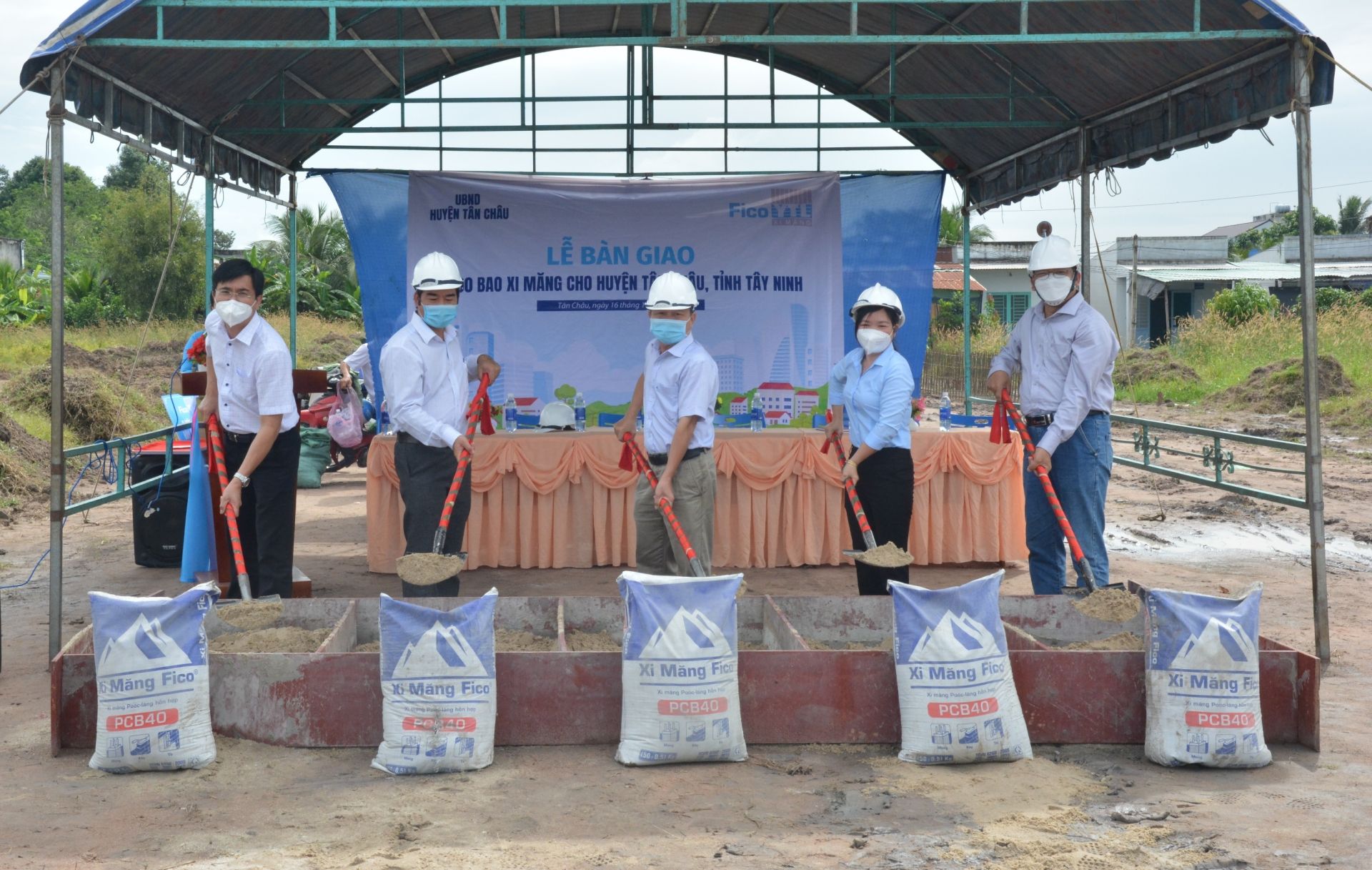 Tại buổi lễ, ông Nguyễn Văn Ngọc – Giám đốc Nhà máy xi măng Fico Tây Ninh trao biển tượng trưng 8.000 bao xi măng cho ông Nguyễn Hoà Bình – Phó Chủ tịch UBND huyện Tân Châu. Số xi măng này sẽ được UBND huyện Tân Châu phân bổ để làm 2 công trình đường giao thông bê tông xi măng tại 2 xã Tân Hội và Tân Hiệp.