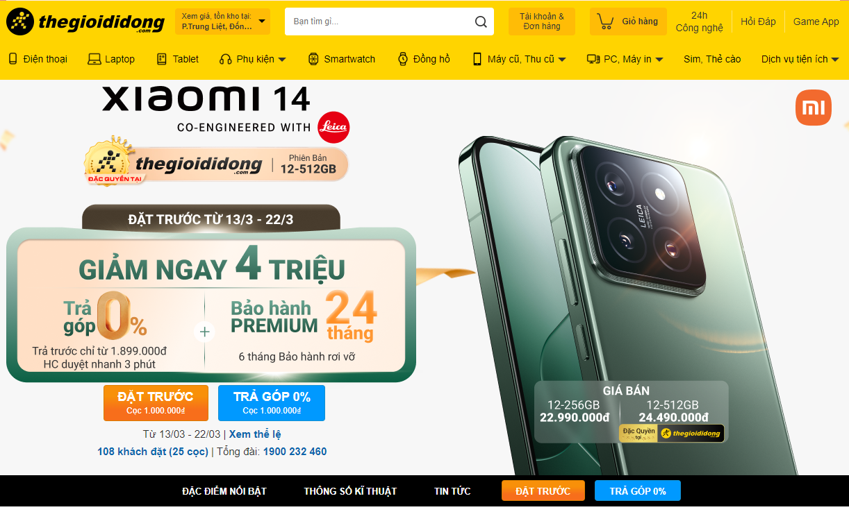 Thegioididong là hệ thống bán lẻ với hàng nghìn có trên 1189 cửa hàng bao phủ từ các thành phố lớn đến những thị trấn hẻo trên toàn quốc. Cũng vì điều này mà giá bán Xiaomi 14 tại đây không hề thấp. Với phiên bản 256GB, cửa hàng bán với giá bằng giá niêm yết của hãng là 22,99 triệu đồng. Phiên bản 512GB được bán với giá 24,49 triệu đồng. Bù lại, khách hàng có thể mua trả góp 0% chỉ cần trả trước từ 1,9 triệu đồng.