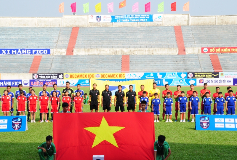 Nhập cuộc khá tự tin, ngay từ những phút đầu của trận đấu các cầu thủ chủ nhà đã triển khai tấn công ồ ạt. Phút thứ 5, từ pha đá phạt của đội trưởng Lâm Văn Ngoan (15-XMF.TN), một cầu thủ đội khách đã lóng ngóng đánh đầu đưa bóng vào lưới, 1-0 cho đội chủ nhà.