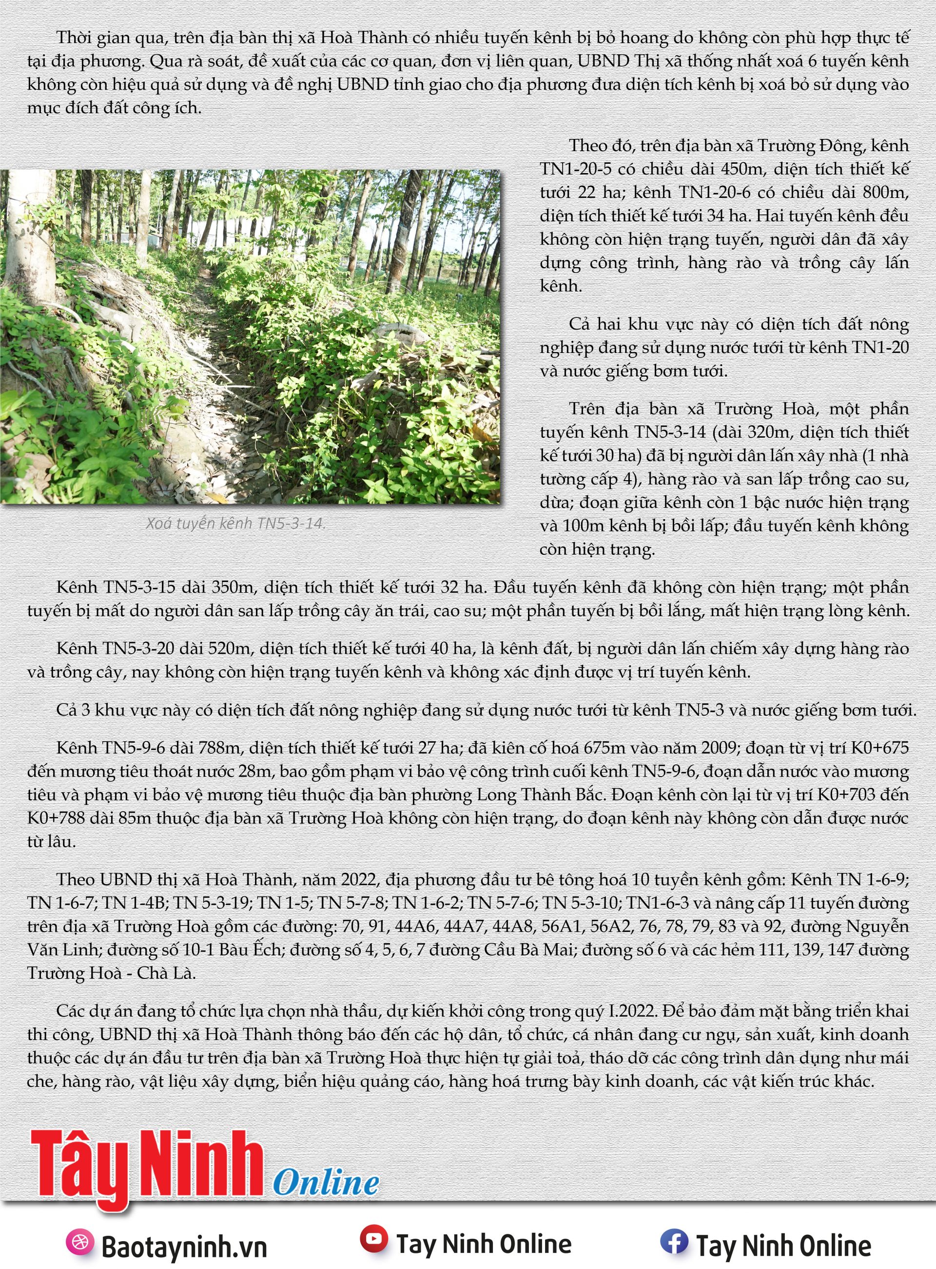 Qua rà soát, đề xuất của các cơ quan, đơn vị liên quan, UBND Thị xã thống nhất xoá 6 tuyến kênh không còn hiệu quả sử dụng và đề nghị UBND tỉnh giao cho địa phương đưa diện tích kênh bị xoá bỏ sử dụng vào mục đích đất công ích. |