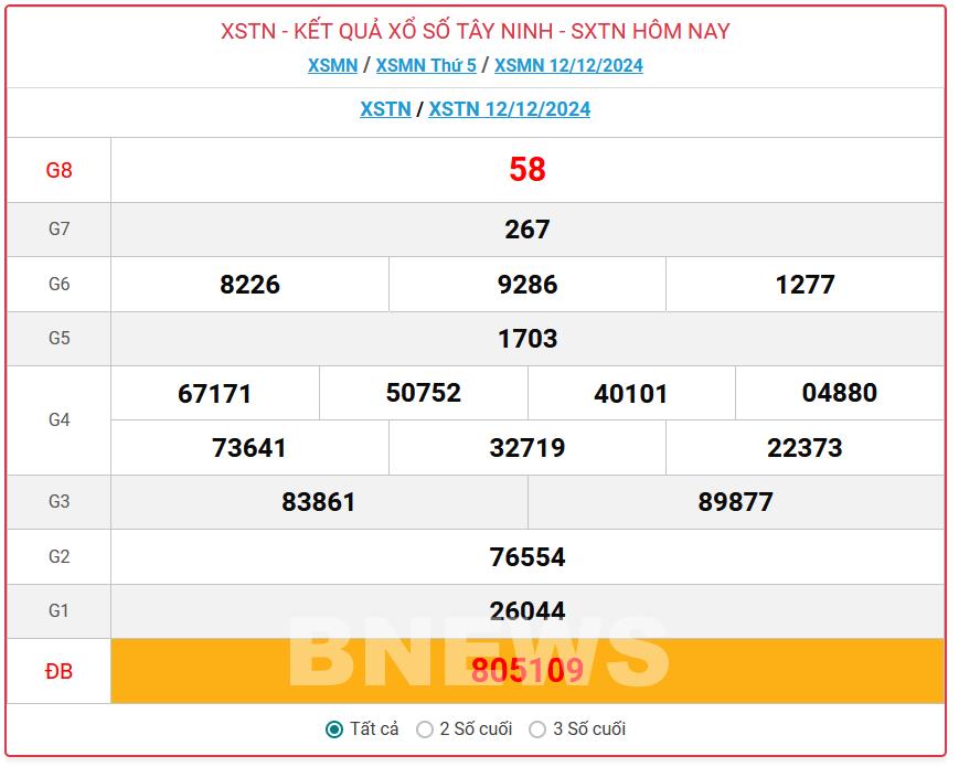 Kết quả xổ số Tây Ninh Thứ Năm ngày 12/12/2024