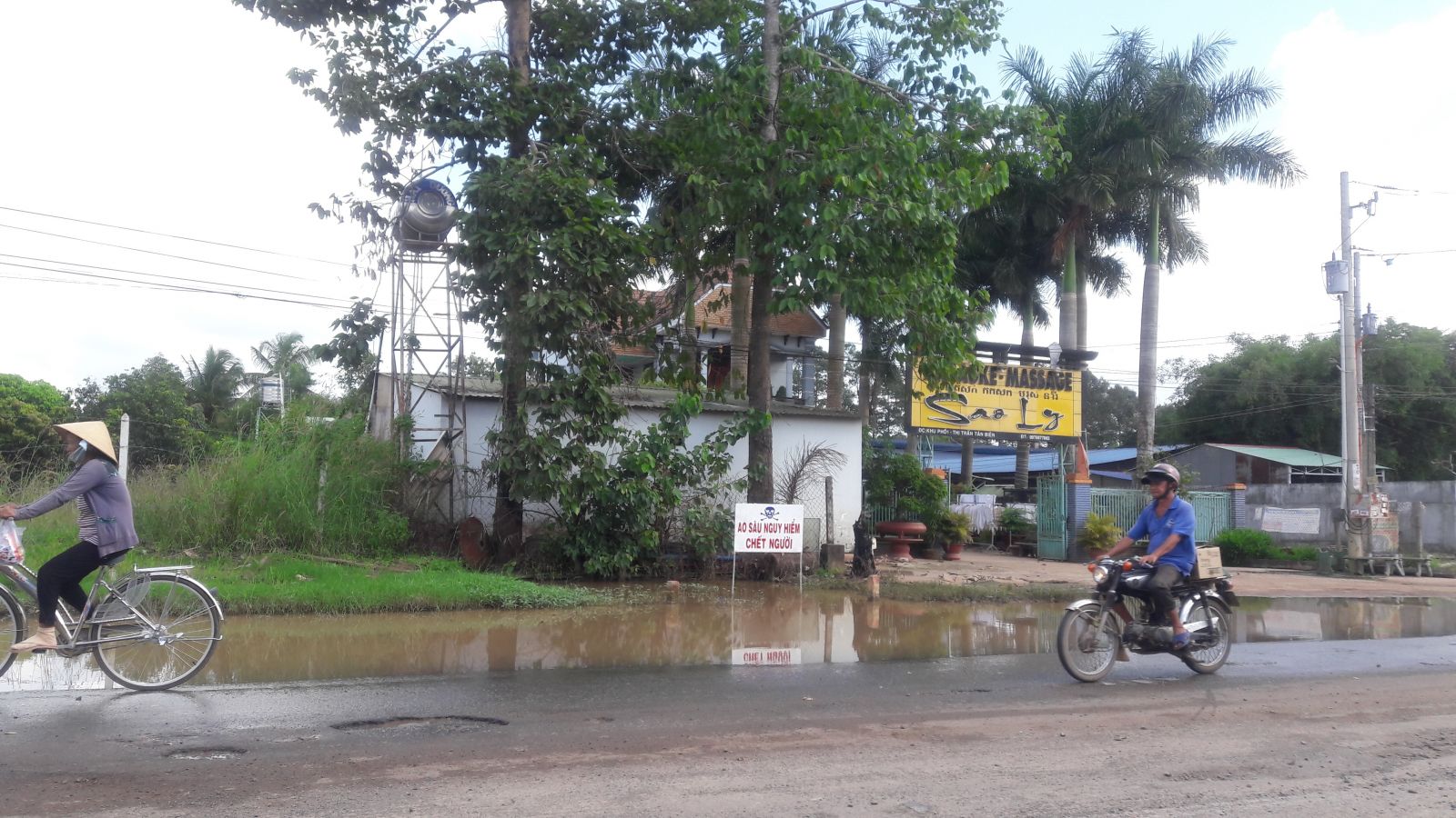 Điểm thứ nhất là tại khu phố 1, thị trấn Tân Biên, thời gian qua xuất hiện một vũng nước to chiếm gần hết nửa phần đường, hiện đã có cắm biển cảnh báo “ao sâu nguy hiểm chết người”. Người dân sống tại khu vực này cho biết, vị trí này thường bị ngập sâu, do hệ thống cống, mương không thể thoát nước nhanh. Người tham gia giao thông không biết, điều khiển xe chạy vào vũng nước này chắc chắn sẽ gặp nguy hiểm. Vì thế, cơ quan chức năng mới cắm tấm biển trên để cảnh báo cho người đi đường biết mà “né”.