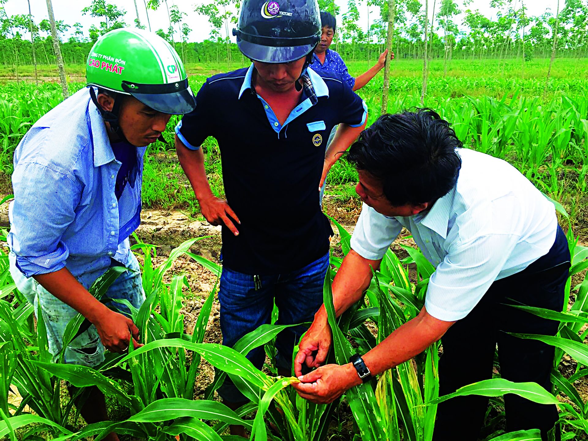 Cán bộ Chi cục Trồng trọt và Bảo vệ thực vật tỉnh hướng dẫn người dân cách nhận biết sâu gây hại trên cây bắp.